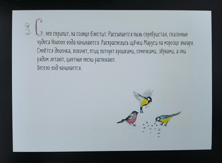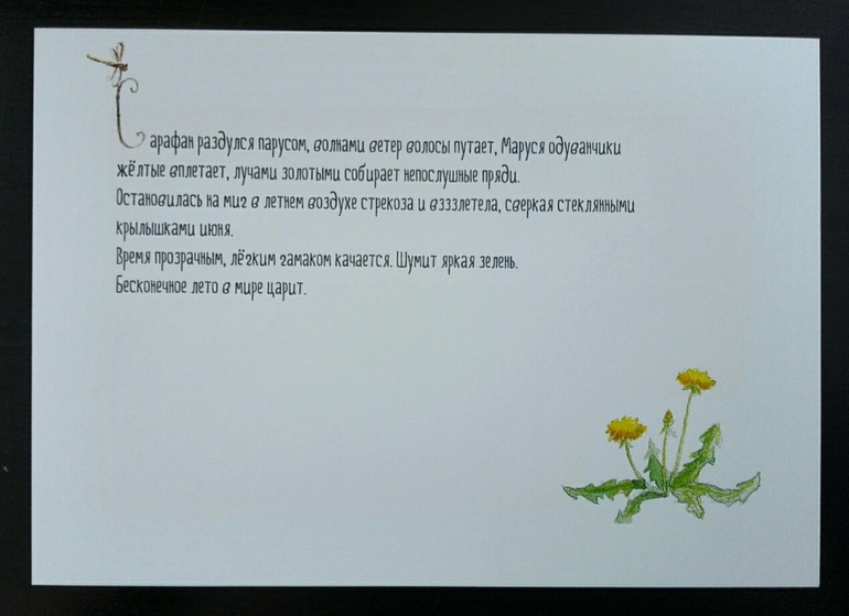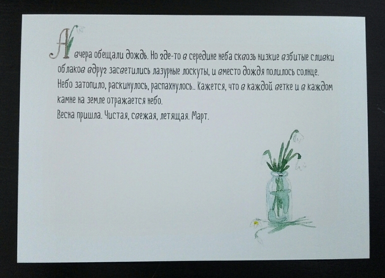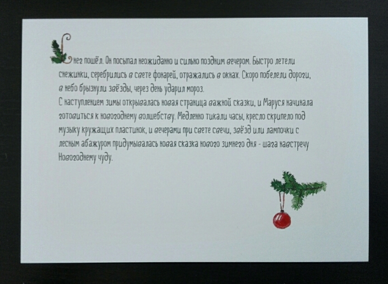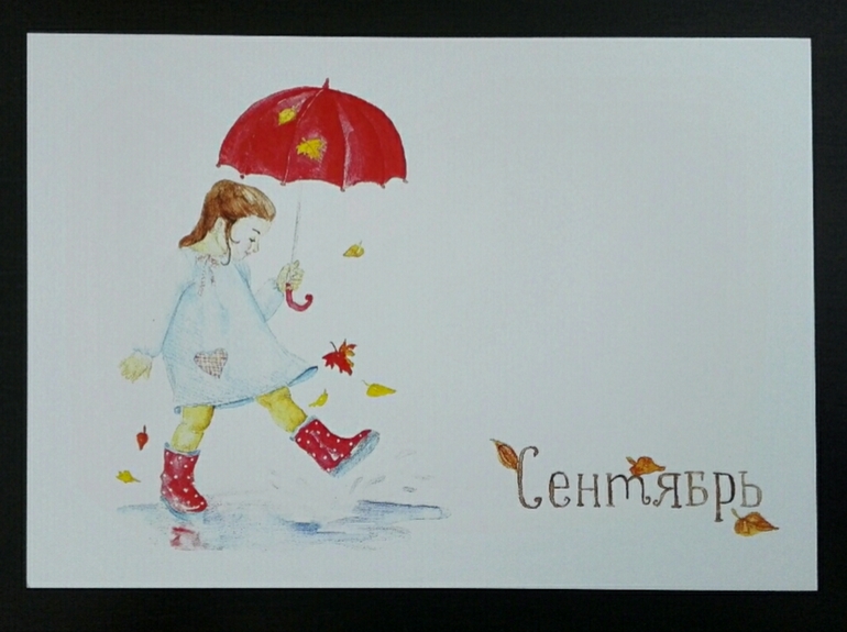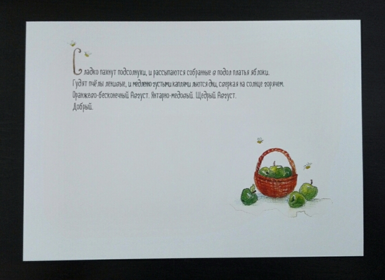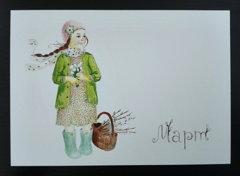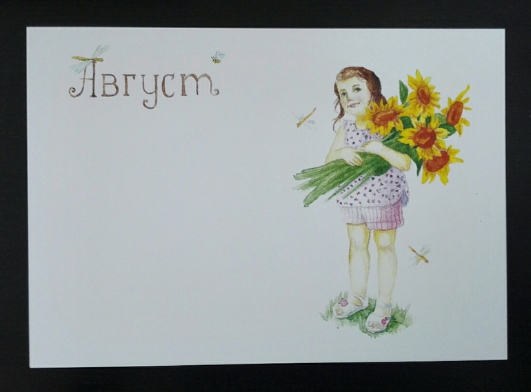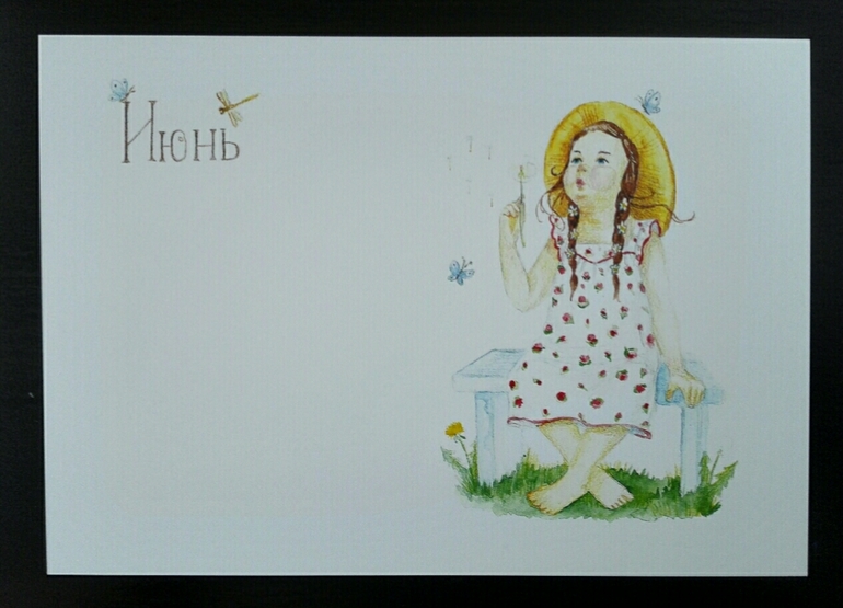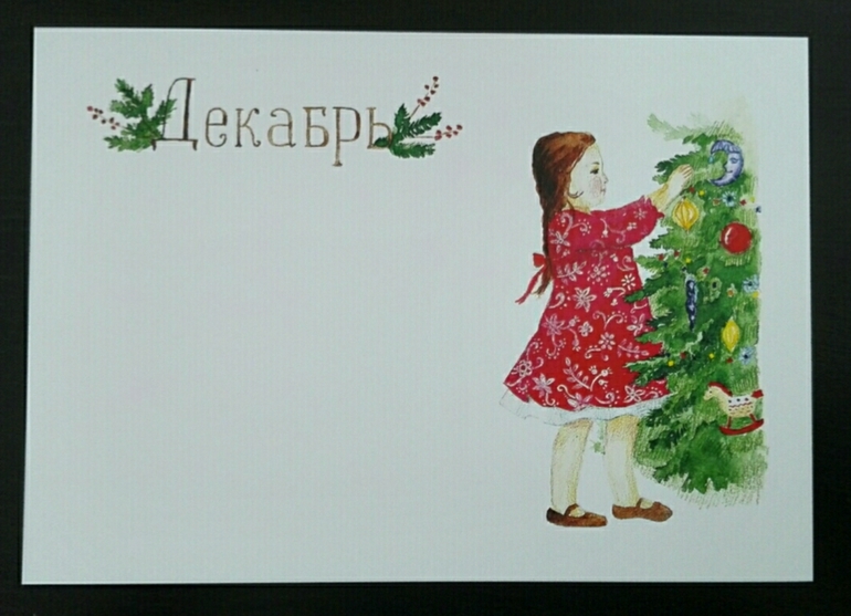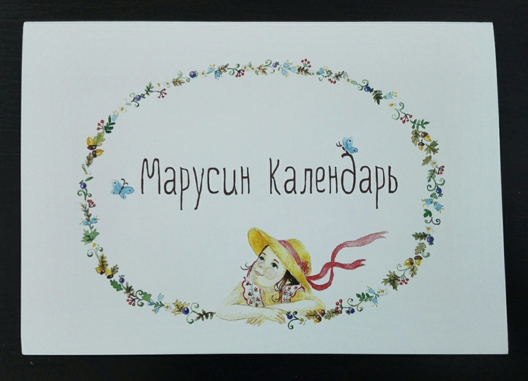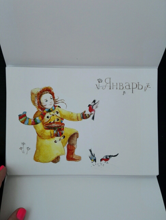 Это календарь не совсем в привычном виде, он в виде открыток А5 формата (21 х 14,8). Каждая открытка соответствует одному месяцу. С одной стороны чудесная иллюстрация ( Дарьи Беклемешевой ) с названием месяца, с оборотной стороны маленькая история о каждом месяце (Кати Колесниковой).
