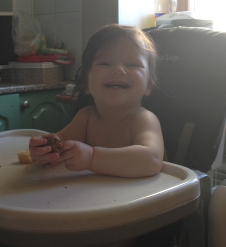В голос смеется, когда расмешишь ее сильно. Например, беру игрушечную собачку и гавкаю за нее - вот тут нам весело, а так обычно просто улыбается. Зубки будут, никуда не денутся.