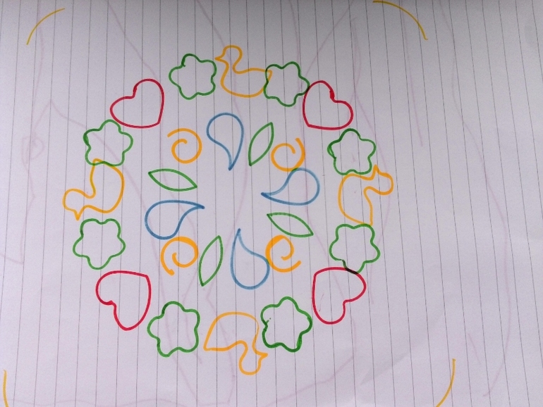 Пока ребенок создавал свою красоту, мама тоже не стала терять времени зря :) Рисование мандал, даже таким способом, увлекает и успокаивает, а это как раз то что нам сейчас нужно.