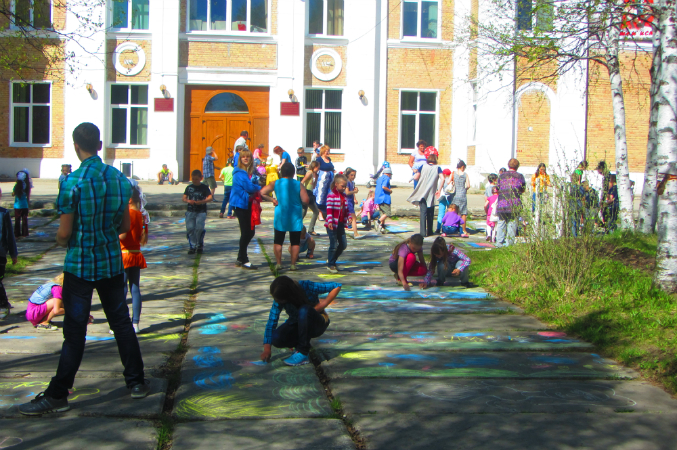 До начала фильма мы немного погуляли. Перед ДК, в котором находится единственный в городе 3D кинотеатр, был праздник детский рисунков на асфальте для учащихся