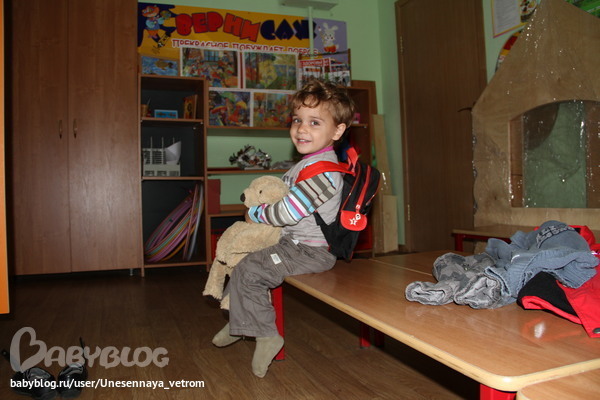 Вторник. Шли мы долго. Переодевались с истерикой. В группу хотел идти только со мной. Еще и воспитателю досталось в момент передачи. В группе минут 10 лежал на ковре в знак протеста. Далее встал и пошел играть. Смял оба завтрака. В 11 счастливый пришел обниматься и целоваться.