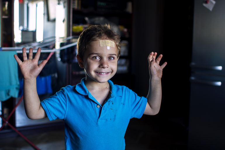 Ничего не предвещало бури среди ясного неба. Мы вчетвером гуляли вечером на площадке недалеко от дома. Эд и Ева непосредственно на горках-качелях, а Робка как обычно в поисках добычи, на этот раз это была яблоня и он подпрыгивая пытался достать мелкие зеленые плоды с дерева. Только я отвернулась усадить Еву и покатать на качелях, как услышала пронзительный крик Урагана. Побежала к нему, а он сидя на корточках прижимал крепко ладошки ко лбу. Присев я наклонилась к нему на лице, ладошках, шее, футболке, шортах была кровь. Тяжело было даже понять насколько серьезно поврежден лоб, кровь не прекращалась литься из раны. Ева подбежавшая к нам смотрела широко раскрытыми глазами и зажимая ушки от безумных Робкиных криков.