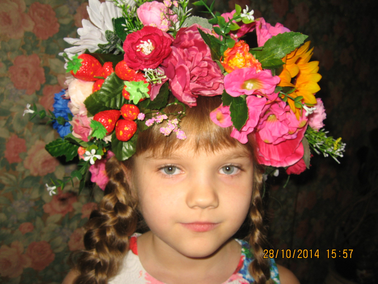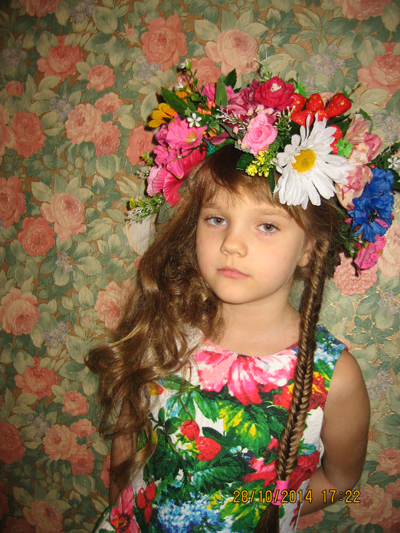 Очень красивая девочка-тьфу на вас.Заплетите ей две косы как на первом фото,только немного растрепаные-очень здорово с венком смотреться будут.
