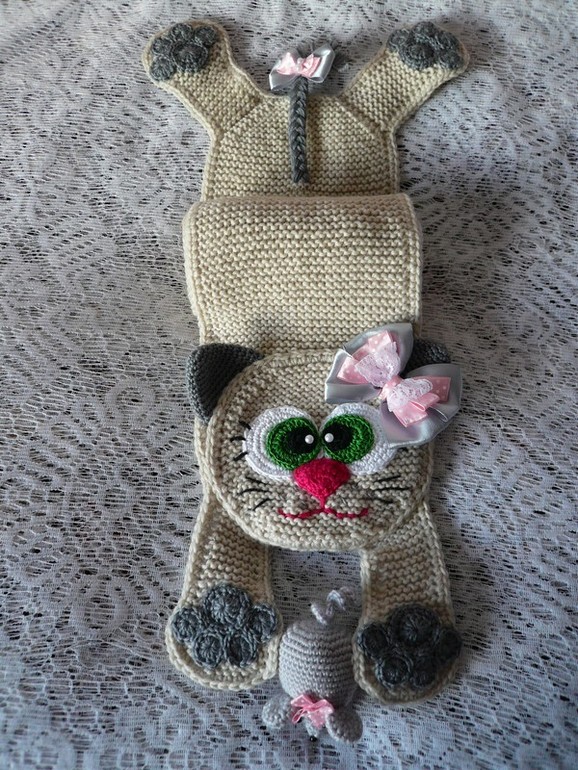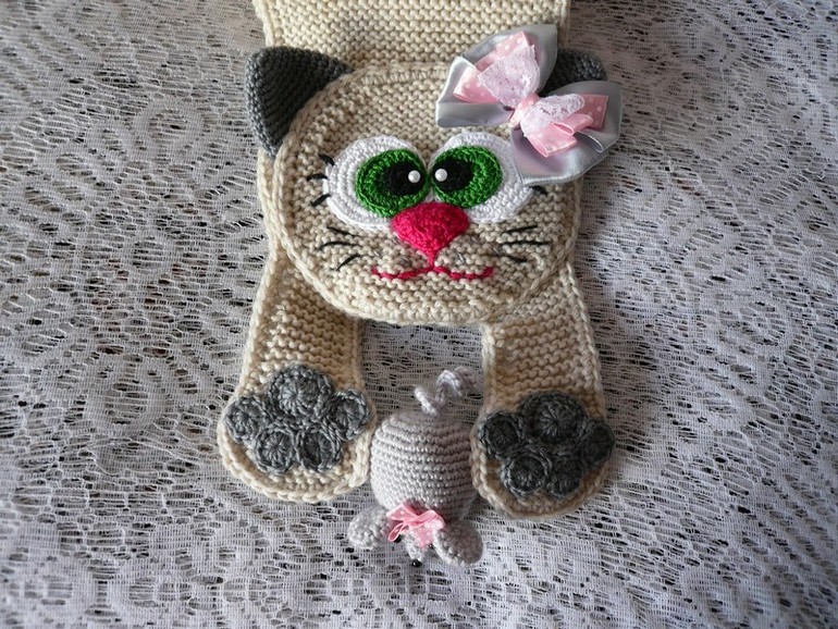 Выполнен из германской полушерсти (шерсть 65 %) приятного цвета топленого молока. Ширина шарфа 16 см, длина 115 см не считая лапок. Лапки не длинные и не мешают при использовании. Симпатичная кошечка с кокетливым бантиком и как настоящая кошка поймала мышку и держит в лапках. Мышка очень тискательная, с торчащими ушками, мягкая и упругая. Даже если ваша малышка не любит носить шарфы - такой не оставит ее равнодушной. Цена 700 руб.