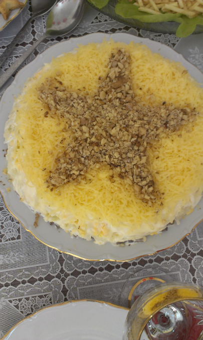Оформление гостиной было выдержано в голливудском стиле. Основными цветами были красный и золотой: золотые звезды с именами гостей, красные салфетки, красно-золотые свечи и воздушные шарики. На стену были водружены фоторамки в виде кинолент с фотографиями всех предыдущих дней рождения.