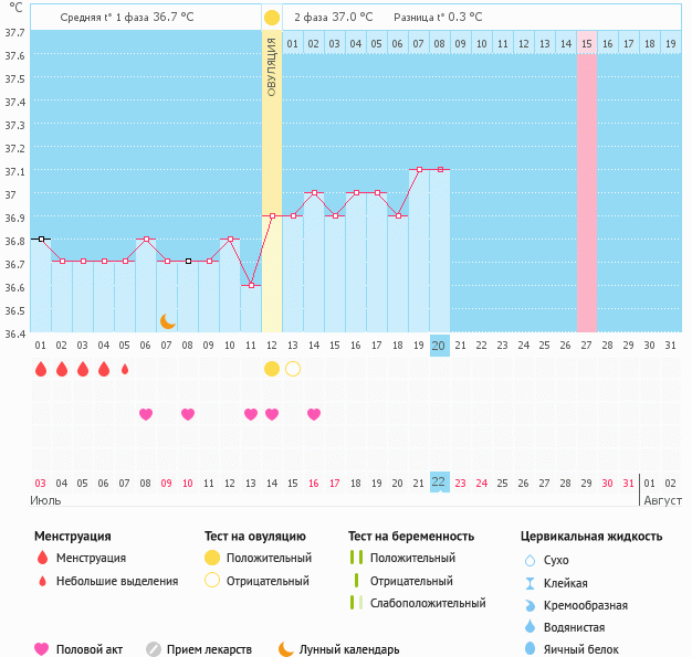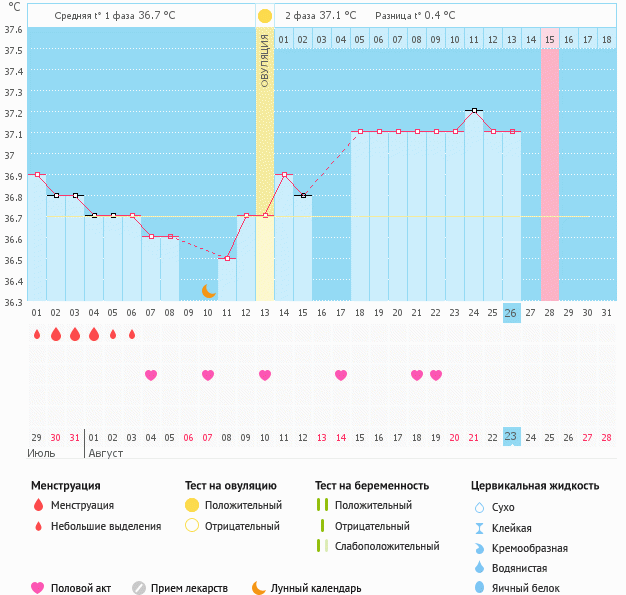 Из ощущений: на 12 дц были тянущие боли ближе к вечеру и все. 11 авг. (14 дц) была у Г на приеме с графиком, так она сказала, что О еще и не было, она почему соотносит ее с самой высокой первой точкой БТ в графике, те исходя из сегодняшнего графика, она бы сказала, что О была на 18 дц.