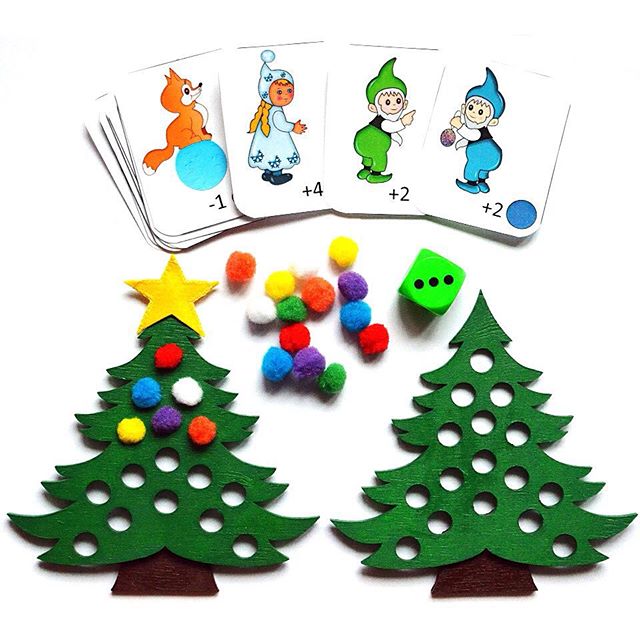 Деревянные елочки, разноцветные помпоны и карточки с чудесными героями, которые были нарисованы специально для этой игры.