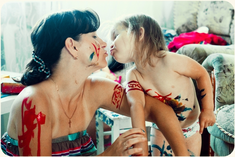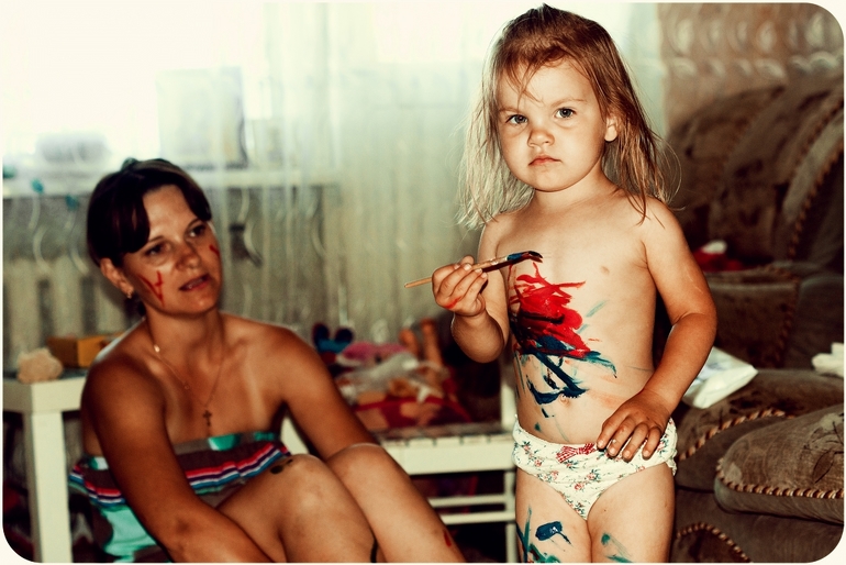 Застелила палас тряпкой, подготовила кисточки и краски, ватман (я склеила 6 листов формата А4). Ульяна сразу заявила, что на ножках и ручках рисовать не будет.