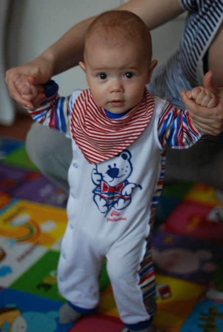 Мой малышНу наконец-то слышу МА-МА!! постоянно мамакаем :) Вобще, разительно вырос за неделю. Постоянно кричит басом ЭЭЭЙ, Дай-дай! Дя-дя, бебе, баба, дада, мама, меме, му. Просыпаемся с мужем от того, что он подползает к нам под бочок и пытается прилечь под крылышко, при этом кусается:) Любит целовать меня-всю оближет, вечно в слюнях хожу. Причем целует во весь рот только меня:) ОООчень любит, когда я его щекочу волосами и целую животик. Улыбка вечно во весь беззубый рот (зубов пока не видно и в помине), а вот смех в голос из него выжать оооочень сложно и то ненадолго!! Кушаем капусту, брокколи, тыкву, морковь, яблоко, персик, творог, банан, каши. Пьем чай и кисломолочную Агушу. ЕДим раз в три часа. Последний раз в два ночи и утром в 8-30. Стул наконец-то наладился-УРРА! Любит карабкаться везде. Я сажусь на полу около дивана, он по мне лезет на плечо (при этом кусая и слюнявля меня), залазиет мне на плечо, с плеча-на кровать, с кровати попой слазит на пол и по-новой на меня :) Игрушки свои разлюбил- обновляем. В ванной купать невозможно! встает на ноги, выкарабкивается из нее и все хватает. А еще папа научил его плевать слюни- один раз показал и всееее.... весь день пфукаем и плюемся! Усиленно пытается уснуть на животе. Смешно выглядит. СПит- переворачивается на живот и начинаееется.. с закрытыми глазами ползет и пытается лечь поудобнее, то на подушку, то на меня, но никак на животе не уснет.. вот и бродит, пока хныкать не начнет, тогда я его на спину кладу. Засыпаем сами, не на руках, без укачиваний, главное условие - песня "Колыбельная Умки", либо в моем исполнении , либо в записи. Моментально засыпает. На руках не лежит и не сидит, укачивать не дает, постоянно пытается сесть, даже когда грудь кушает. Сядет и пытается есть, а я прям как акробат выкручиваюсь :) Полюбил Ладушки, бьет своей ладошкой об мою, о двумя своими ручками не понимает пока. Когда слышит Ладушки аж трястись начинает и визжать!! Нормально ползать так и не начали, все прыжками, но ооочень быстро, особенно если впереди цель ввиде моей чашки-пульта-телефона. Под катом фото.