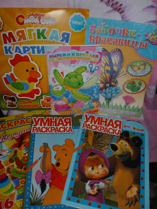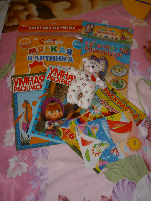 Много раскрасок (Маша и медведь наши любимые)), аппликации (очень любим ножницами все вырезать)), объемные модели (бабочки на цветочке) и мягкая картинка-петушок (чуть сломался в дороге, но наш папа его починил))