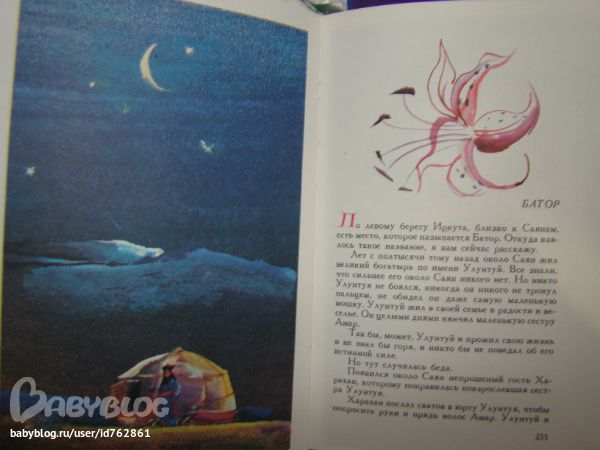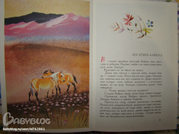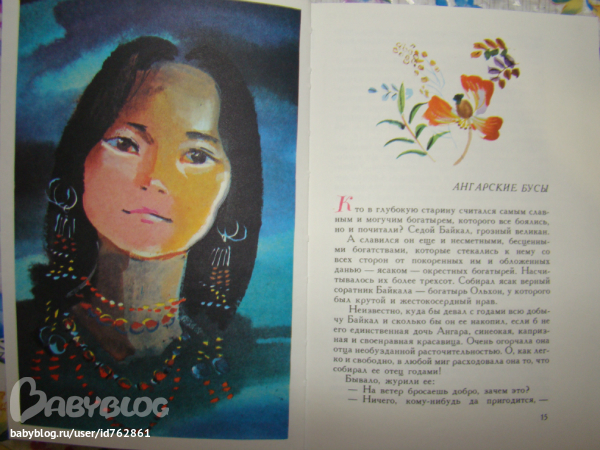 Я очень любила сказку "Ангарские бусы" про красавицу Ангару и могучего Енисея. Вкратце: У Байкала была дочь -красавица Ангара.И была у нее шкатулка с сокровищами которые она не кому не показывала. В шкатулке были бусы самоцветы удивительной красоты. одной только няне ангара сказала что оденет их тогда когда полюбит. Много кто к ней сватался, но она отвергала всех. Байкал же пообещал дочь молодому витязю Иркуту, но не нравился он Ангаре. На состязаниях в часть летнего праздника Сур-Харбан влюбилась она в витязя Енисея потомка гордого богатыря Саяна. отец узнав об этом посадил ее в темницу. Но прекрасная Ангара вырвалась благодаря маленьким ручейкам которые подточили стены темницы. Убежала Ангара как не сверепствовал Байкал. Пытался поймать ее Иркут, но пробежала мимо Ангара навстречу своей любви! А по пути брала и бросала под ноги свои бусы со словами "Пусть загорятся здесь огни жизни, огни счастья, огни богатства и силы!" А самые красивые одела на себя когда подбегала к Енисею. "И бросились они в объятья друг другу. Хоть уговора между ними никакого не было,а вышло так, будто ждали они этого часа давным-давно" Красивая сказка. Эти самоцветы на самом деле существуют мой папа дарил маме их в молодости тогда они стоили копейки. Папа читал сказку, а я перебирала в руках эти бусы. Как они переливались на свету всеми цветами радуги!!!! И казалось мне, что я на яву вижу и Ангару и Енисея и могучего Байкала! Такие воспоминания!!!!!!