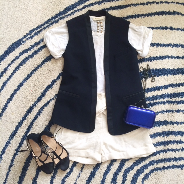 Начну со своего фаворита - черный жилет, лучшая вещь из списка! Я уже сразу его уложила в новый сет, куда войшли новые шорты Maje из посылки, клипсы Max Mara, новая сумочка и моя любимая белая футболка на все случаи жизни