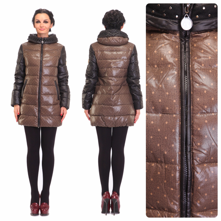 Принт в мелкий горох выглядит всегда современно и очень женственно. Чтобы подчеркнуть элегантность рисунка, рукава, капюшон и отделка карманов выполнены из однотонной ткани насыщенного шоколадного цвета. Тему горошка продолжает декоративная металлическая отделка капюшона и, даже, пуллер на молнии. Еще одной особенностью является необычное изящное украшение на рукаве. Чуть приталенный удлиненный пуховик с утеплителем из натуральных материалов будет надежной защитой от зимних морозов. Не слишком броский, но оригинальный дизайн пуховика позволяет сочетать его с одеждой любого стиля.