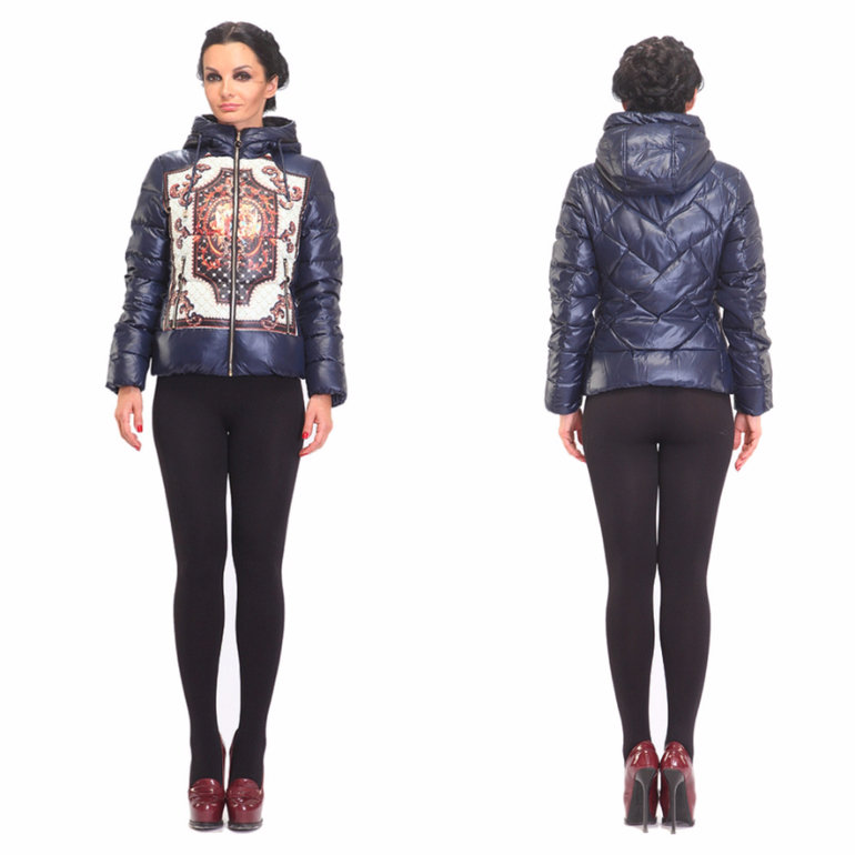 Коротенький пуховик с легким блеском и минимумом деталей модно было бы посчитать очень простым и принять за спортивную курточку, если бы не оригинальный крупный рисунок на полочке. Его форма и дизайн вызывают ассоциацию с древним гербом и сразу переносят нас во времена средневековых рыцарей и благородных дам. Может и Вы одна из них? Добавят торжественности модели блестящие змейки застежки. А защитить красавицу от грозного врага - зимнего холода сможет утеплитель из натуральных материалов и высокий воротник, переходящий в аккуратный капюшон на завязочках. Благородный синий в качестве фона позволит все внимание сосредоточить на рисунке.