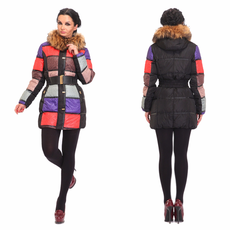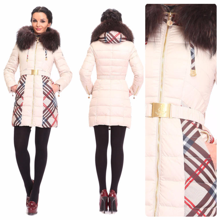 Нежный молочный цвет пуховика прекрасно оттеняет кожу лица, делая ее более свежей. Женственности модели добавит и длинный натуральный мех енота. Его цвет пересекается с цветом боковых вставок, что позволяет создать единый стильный образ. Талия подчеркнута пояском с блестящей пряжкой, но взгляд задерживается именно на цветной вставке в районе бедер. Ее рисунок с косой клеткой дает интересный эффект: она и помогает скрыть ширину бедер, и, в то же время, привлекает к ним внимание. Т.е. модель пуховика идеальна для любого типа фигуры.