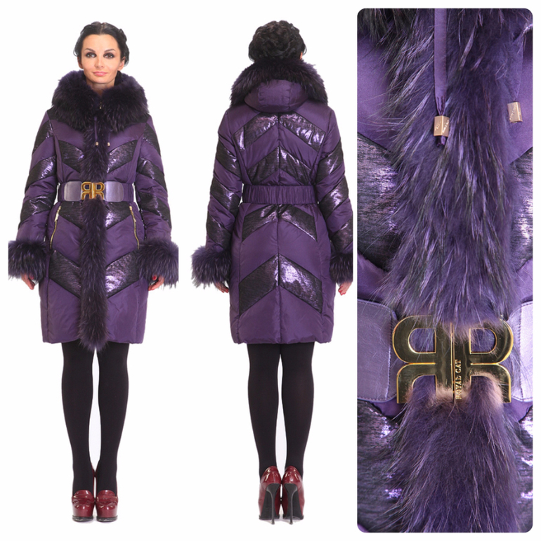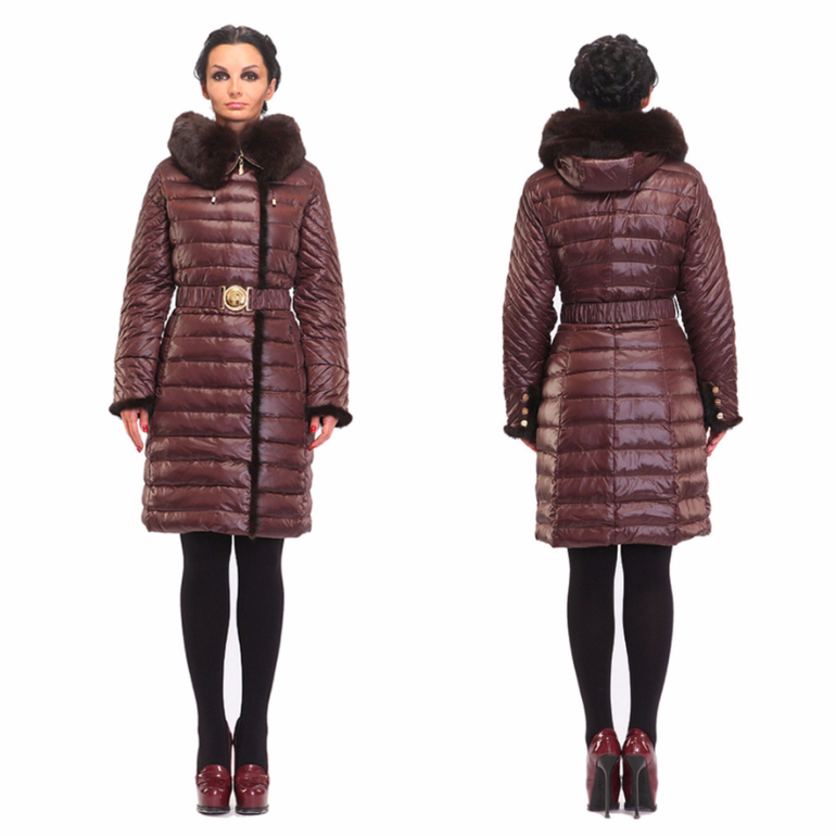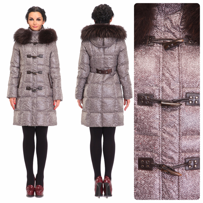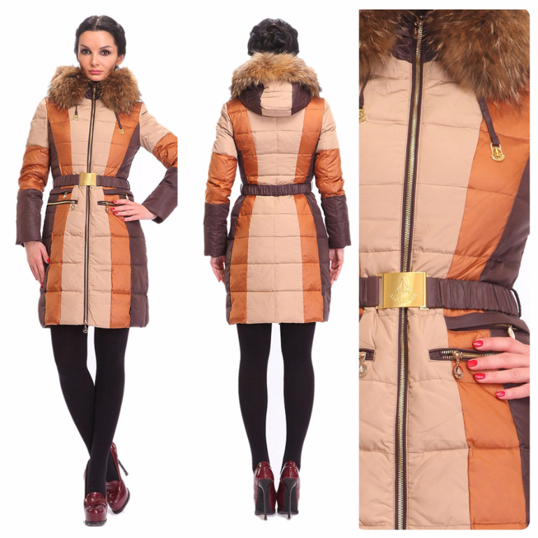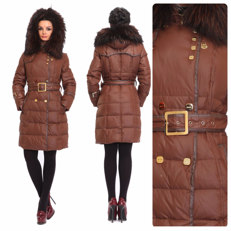 Приятного шоколадного цвета пуховик сразу вызывает чувство уюта. В нем по-домашнему тепло и комфортно. Женственности модели добавит и длинный натуральный мех енота. Его темный цвет с подпалинами хорошо гармонирует с основным цветом пуховика, что создает единый стильный образ. Талия подчеркнута пояском с блестящей пряжкой, но взгляд задерживается именно на цветной вставке в районе бедер. Ее рисунок с косой клеткой дает интересный эффект: она и помогает скрыть ширину бедер, и, в то же время, привлекает к ним внимание. Т.е. модель пуховика идеальна для любого типа фигуры.