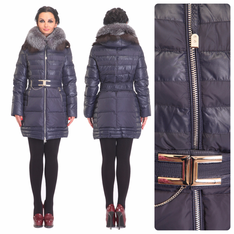 Несмотря на горизонтальную стежку на пуховике, ее одинаковая ширина и направление визуально делают фигуру стройнее. Такой эффект усиливает и длина, которая прикрывает бедра, но делает ножки длиннее. А отделка мехом планки застежки и вертикальные входы в карманы, спрятанные в швах, еще больше вытягивает фигуру. Узенький ремешок, подчеркивающий талию, множество блестящих пуговиц на рукавах и такая же пряжка - все эти детали делают модель очень стильной и благородной. Пуховик дополнен мехом кролика породы рекс - это очень качественный, красивый, легкий и ценный мех.