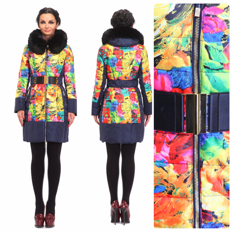 Даже яркие цвета однотонной одежды Вас больше не радуют? Тогда нужно что-то новенькое. Буйство цвета в сочетании с абстрактным цветочным рисунком - о плохом настроении этой зимой можно забыть! Удлиненный пуховик синего цвета с большими цветными вставками напомнит картины итальянских художников. Мыслями Вы сразу оказываетесь под палящим солнцем, а основной синий цвет напомнит о море. С таким чувством не страшно выходить в любые морозы. А утеплитель из натуральных материалов придаст уверенности, что это ощущение не исчезнет на улице. Темная ткань на боках и по низу рукавов сделает стройной даже не самую идеальную фигуру. Подчеркнуть талию поможет широкий пояс на резинке. И, конечно, натуральный мех песца не только очень красив: он подарит надежную защиту от холода.