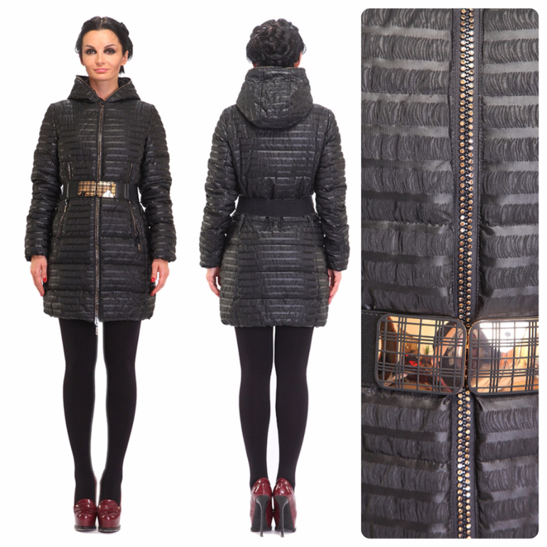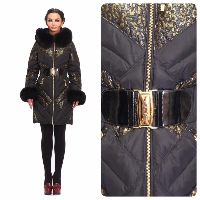 Глубину черного цвета подчеркивает блеск золота. Мелкие стразы рисуют вертикальные линии силуэта. Отделка золотом вдоль внешнего края капюшона, входов в карманы и застежки плюс ткань с оригинальным рисунком - все, что нужно, чтобы удлиненный пуховик стал очень элегантным. Его нарядный вид даст ощущение праздника каждый день. Подчеркнуть тонкую талию поможет широкий пояс с большой золотой пряжкой простой формы. Длина до середины бедра и натуральные материалы утеплителя - залог защиты от любых морозов.