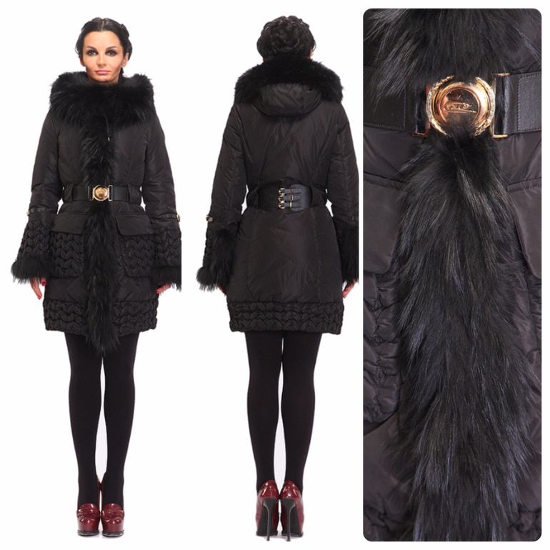 Для любительниц классики: черный зимний пуховик с натуральным утеплителем, натуральным мехом енота и длиной, прикрывающей колено.