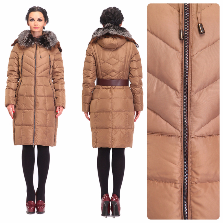 Элегантный светло-коричневый коричневый пуховик с широким кожаным поясом оригинального дизайна и меховым воротником необычной формы. В нем идеально сочетаются стиль и практичность. Многочисленные карманы на молнии не только функциональны, их расположение и дизайн придают стройность модели. Классическая длина до середины колена и приталенный силуэт, дополнительно подчеркнутый поясом, в сочетании с утеплителем из натуральных материалов обеспечивают и надежность защиты от холода, и универсальность модели. Такой крой хорошо комбинируется с одеждой любого стиля, а нейтральный оттенок хорош как сам по себе, так и в компании практически любого цвета.