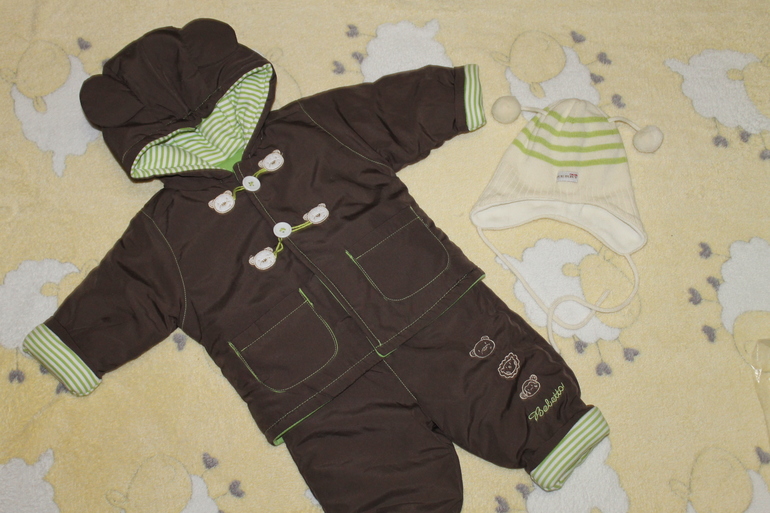 Производство-Турция. Р-р 3-6 мес/62 см.,но реально до 68. Рукава и штанины можно регулировать по росту отворотами. Подклад хлопок. Цвет насыщенный шоколадный. Украшен аппликацией и вышивкой.