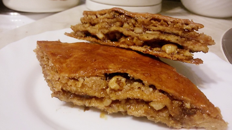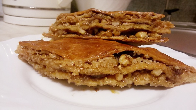 Орехи измельчаем, в блендере не желательно, т.к. много масла выделится и они будут сырые. Самый удобный способ - в пакетик, положить на дощечку и побить скалкой пару минут:) Изюм желательно предварительно залить кипятком. Смешиваем орехи, корицу, изюм и сахар, начинка готова. Раскатываем тесто тоненькими пластами, смазываем топленным маслом и сверху высыпаем начинку. Так поступаем с каждым слоем.