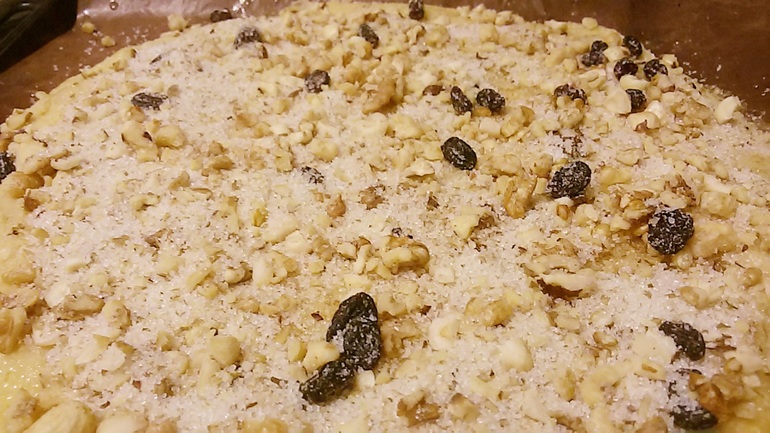 Начинка с изюмом и разными орешками получается очень ароматная, с изюминкой:) в прямом смысле этого слова, хранится такое лакомство до недели. Особенно вкусно когда остынет.