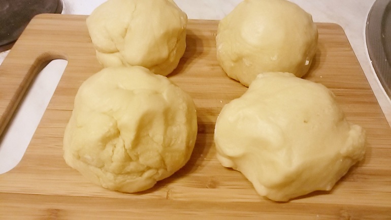 Взбиваем яйца с растопленным маслом и молоком, добавляем гашенную соду и муку, вымешиваем тесто, делим его на 4 части по 200 гр.