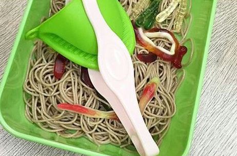 И напоследок, самая необычная сенсорная коробочка (я бы сказала, на любителя) - в качестве наполнителя, лапша (почва) и мармеладные "дождевые" червячки.