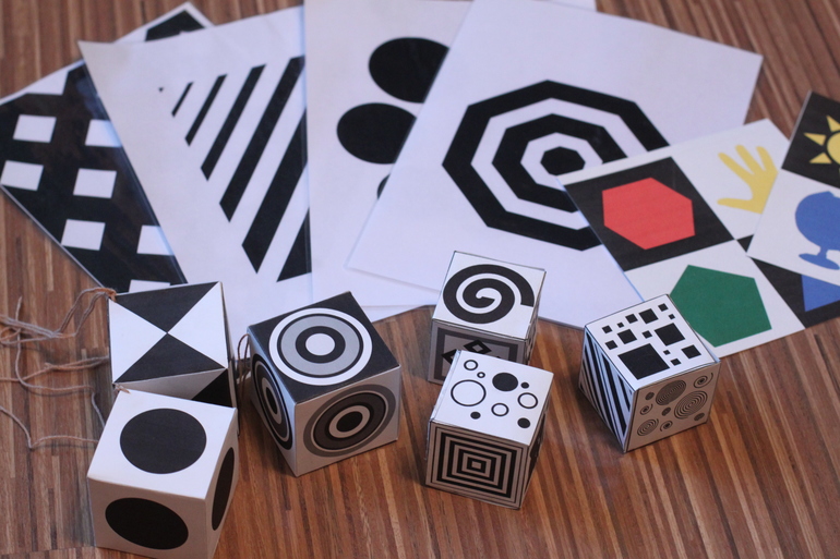 Для него распечатала черно-белые и цветные картинки, склеила кубики. Все материалы брала с просторов интернета, как выяснилось вариантов масса, на любой вкус и цвет.