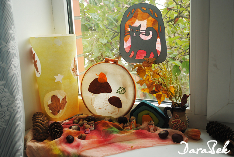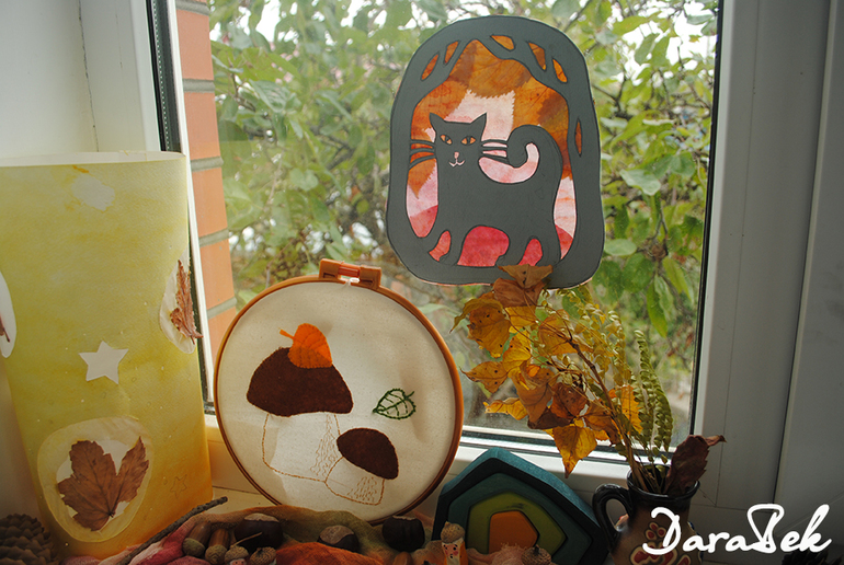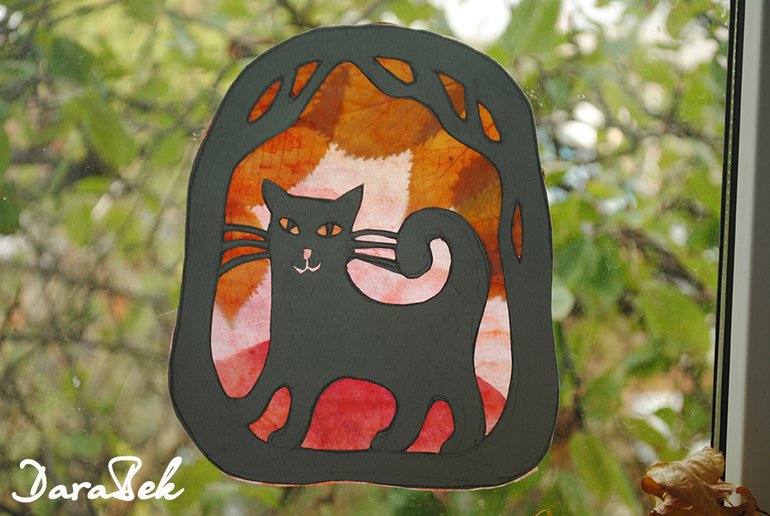 Ну и дальше дело фантазии. Мы вырезали из цветной кальки подходящий кусочек и наклеили с обратной стороны витража. А еще украсили сухими осенними листьями, которые заранее собрали в парке и засушили в книжке..