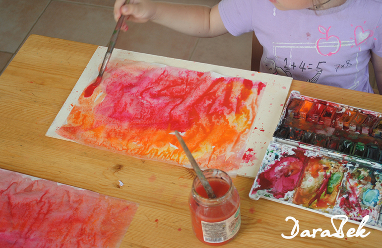Цветную кальку мы делаем сами. Просто красим обычную прозрачную кальку акварельными красками. Даем высохнуть. Потом можно лист промаслить ватой, смоченной в подсолнечном масле и прогладить утюгом, чтобы снять излишки масла.