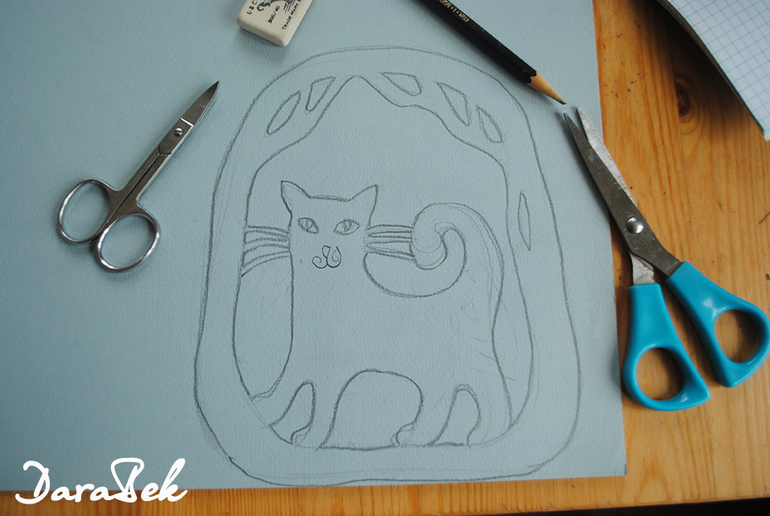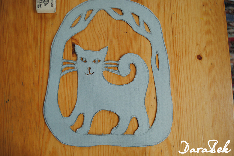 Я нарисовала на плотном картоне кота, а дочка пририсовала ему мордочку.