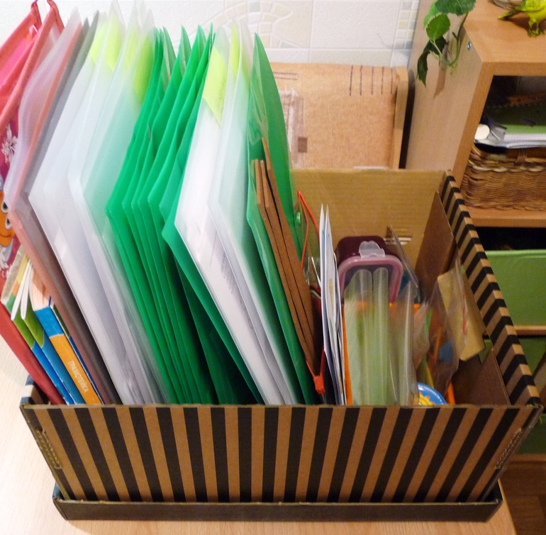 Офисная подставка, коробка с папками нашли себе место на холодильнике. Компактно, наглядно, удобно.