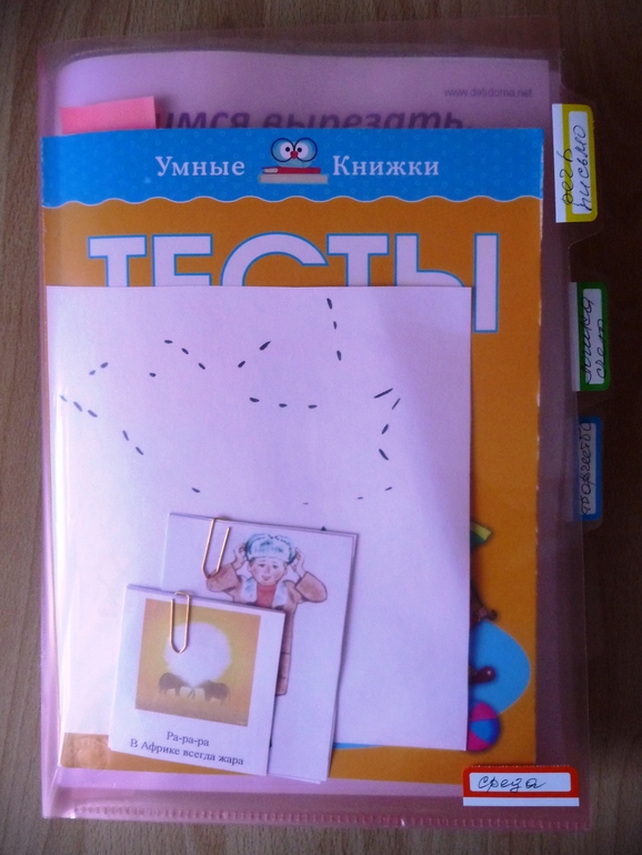 На каждый день отведена отдельная папка с тремя делениями - речь/письмо, логика/счет, творчество.