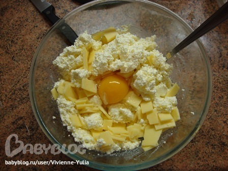 В творожно +- сырную массу добавляем 1 яйцо. Все хорошенько перемешиваем и солим.