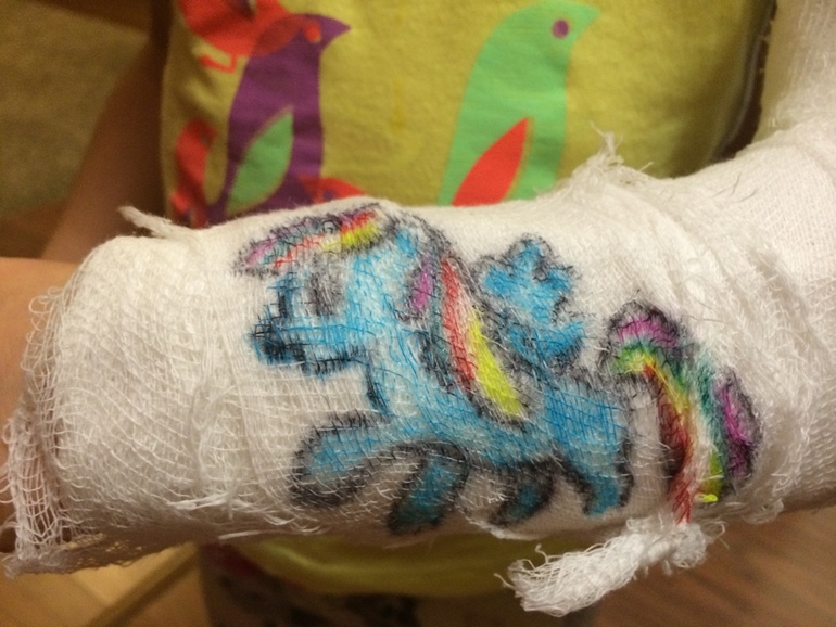 Гипс сняли на 5-ый день. От ушиба остался только небольшой синяк. Договорились, что больше никогда-никогда так падать не будет, чтоб у мамы больше волосы на голове не сидели. А лошадь, это папа развекался. Не плохо вышло, на мой взгляд)