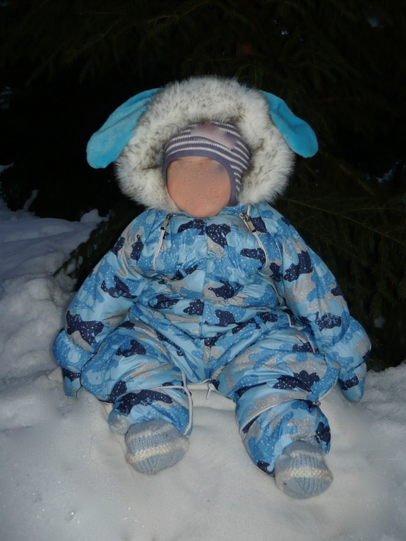 Ручки, ножки и горлышко плотно закрываются, не пропуская внутрь холодный воздух. Две молнии по бокам глубоко раскрываются, облегчая процесс одевания. Глубокий капюшон, можно одеть на любую шапочку. В комплекте теплые варежки. На капюшоне очаровательные плюшевые заячьи ушки. (еще фото в конце поста)