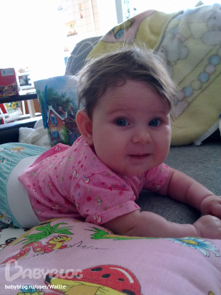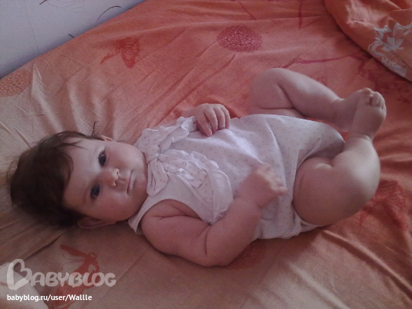 Сходили вчера на прием, 8кг и 65см, вот какие мы стали! снизу лезут зубки, будем ждать, по прежнему какаем раз в несколько дней, но ее это не беспокоит. Умеем переворачиваться со спины на животик с обоих бочков, а вот обратно еще нет, хотя раньше умела, а щас просто утыкается носом в диван и пищит :)