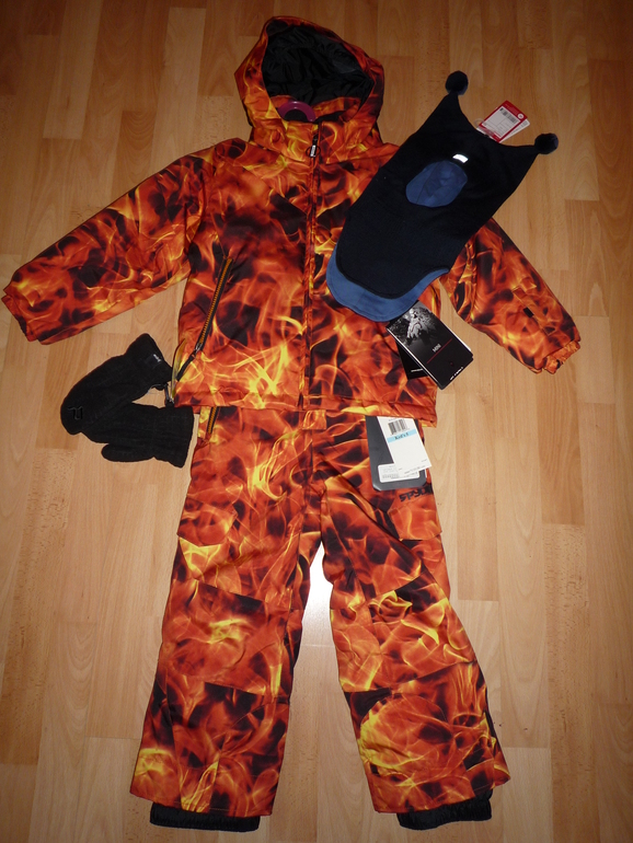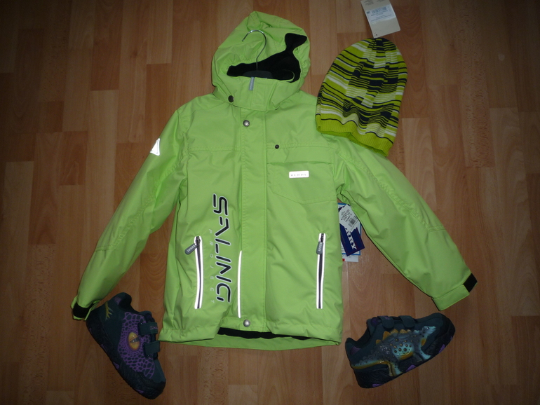 2. Потом прыгаем в более легкий вариант - Kerry 80гр, 122 р-р и х/б шапулю Huppa. На ноги уже традиционные Dinosales, только со стегозаврами (в прошлом году были с тиранозаврами). Динозавры у нас сейчас рулят!