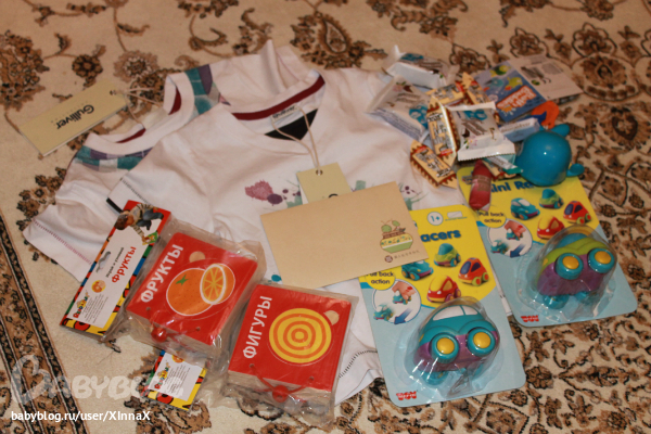 Футболки еще не примеряли, они ждут нас до лета, а вот книжки и машинки сразу пошли в ход! Ребятам очень понравились книжки, везде их таскают с собой! А как удобно грызть )))), ведь они деревянные.