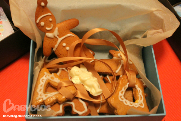 В каждой коробочке были имбирные печенья разных новогодних персонажей (на фото видно не всех) и по два пчеченья-украшенья на елку + шоколадный ангел.