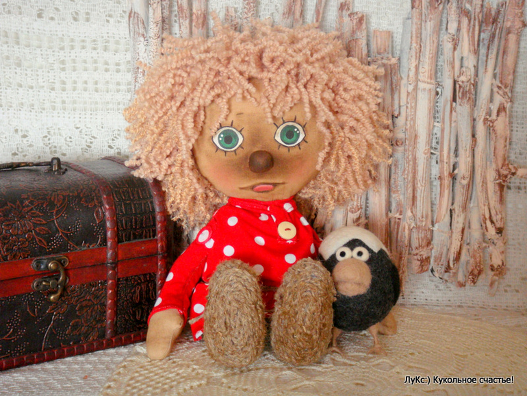 Сшит из вискозы, набит опилочками и гранулятом, рожки, копыта и ботиночки из Паперклея, глаза-стекло, 6 шплинтов, расписан маслом. Штаны из льна и микровельвета, кепка из микровельвета. Одежда снимается. Сидит хорошо, стоит тоже, если попросить вежливо)