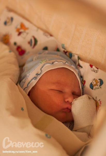После родов мы с масиком еще 3 суток были в РД. В палате было 3 мамочки с дитями, было очень шумно, поспать вообще не удалось. В итоге я была такая изможденная от недосыпания, что на третье утро вот такое приключилось: я взяла малыша к себе в кровать, что покормить, он сначала просил грудь, а потом вырубился... ну и я решила с ним вдремнуть. И тут я просыпаюсь от того, что меня дергает соседка по палате и говорит: "Ксения, у тебя малой орет!". Вот это я провалилась, малой под ухом заливается плачем, а я не слышу))) это прикол))