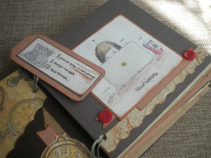 Сделала ей блокнотик. Пыталась стимпанк, получился какой-то гибридный винтаж, с юморныс уклоном.