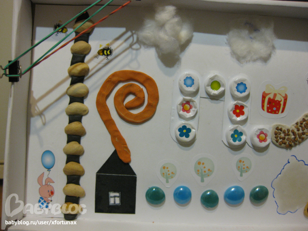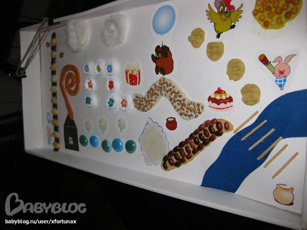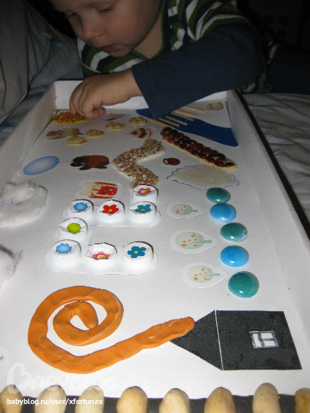 У Вани появилась потребность шагать пальчиками, вот и возникла идея придумать что-нибудь компактное и разнофактурное в одном месте. Похожие дорожки видела и на бб, уже не помню у кого.