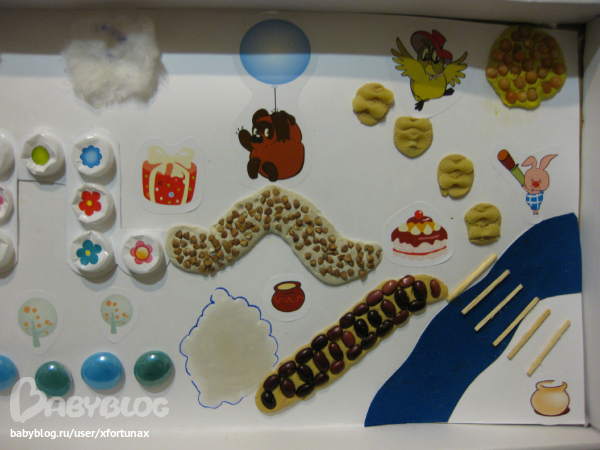 Ваня помогал мне крупы прижимать к пластилину, выбирал наклейки, советовал, что куда клеить, )))