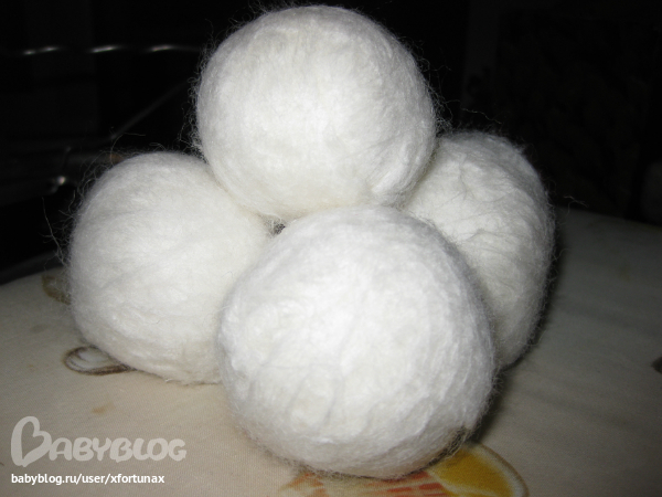 Для игры в снежки я решила попробовать свялять их из шерсти. Это мой первый опыт валяния, пришлось кое-что подделывать, потому что в процессе игры они сильно распушились. Но игра в снежки у нас сейчас одна из любимых.
