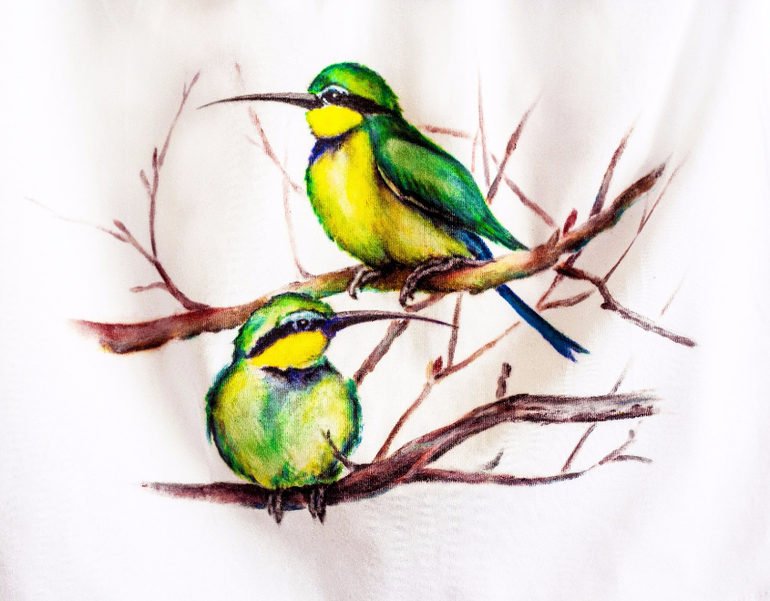 Ручная роспись детской футболки "Птицы", 1400руб, Роспись выполнена в технике акварельной живописи без использования резервирующего состава.